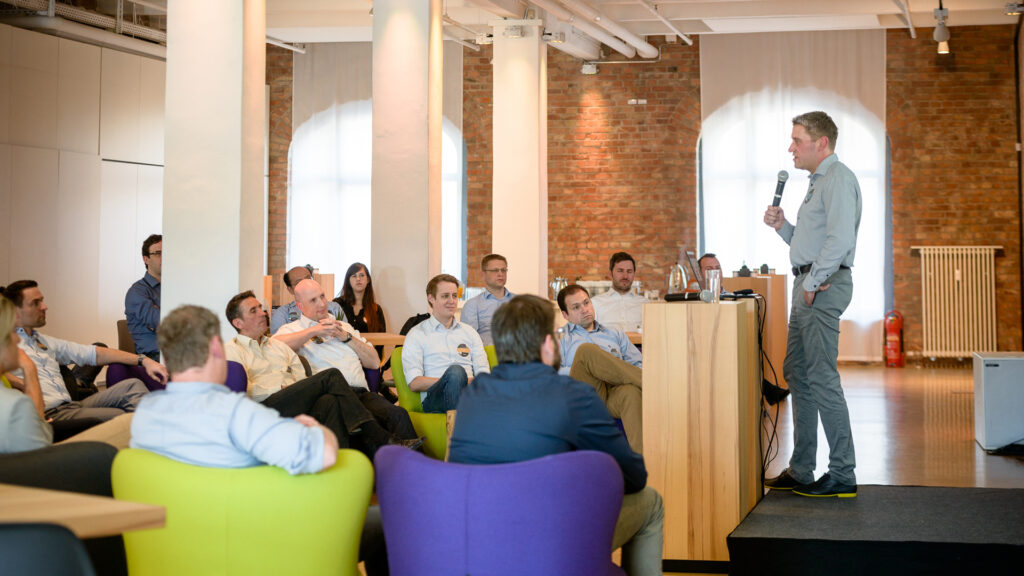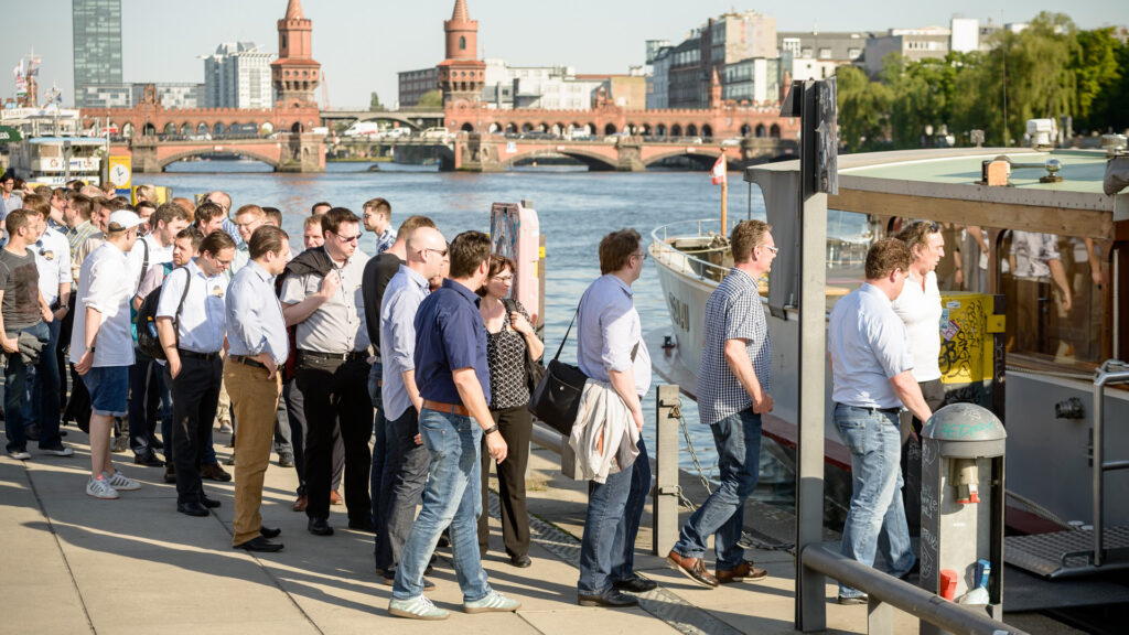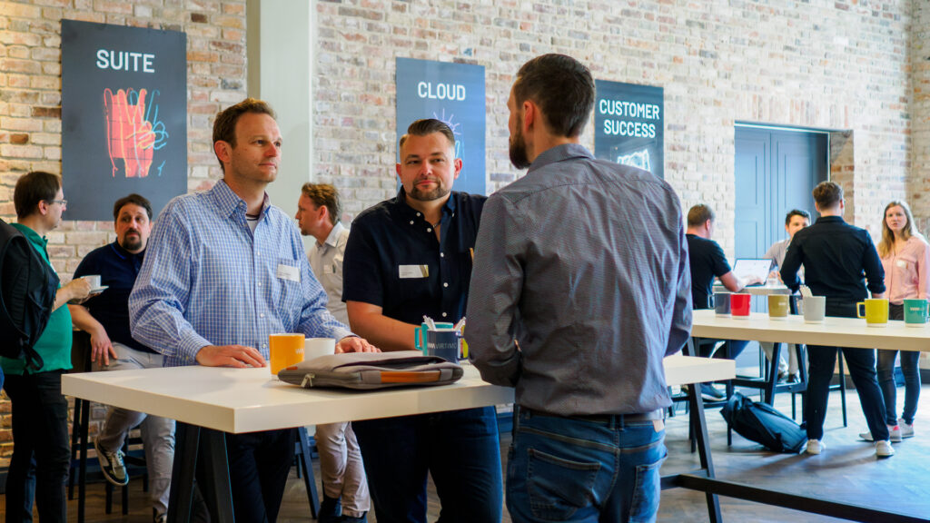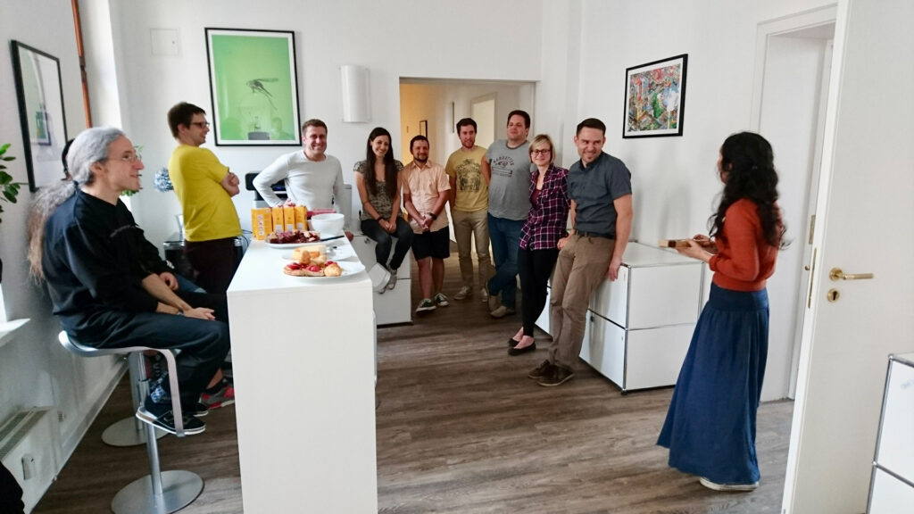 2015 folgte mit dem Business Process Center [BPC] unser erstes eigenständiges Produkt. Das Team und die Aufgaben wuchsen, sodass wir aus dem geteilten Gewerbehof an der Spree in unser größeres Büro in der Berliner Münzstraße zogen. Parallel dazu bauten wir unsere Präsenz aus: Auf der E-world mit unserem ersten Messestand, im Team mit dem Start von Work & Travel im europäischen Ausland und für unsere Kund:innen mit der allerersten VIRTIMO VISIONS – mit sage und schreibe 45 Gästen.