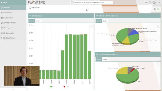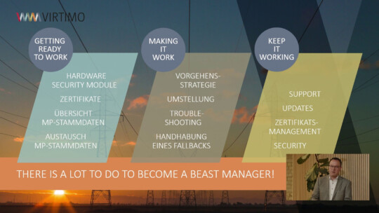 26. April 2023 VIRTIMO [VIRTUAL] EVENT: DIE NEUE MAKO MIT BSI AS4 VERANSTALTUNG. Mittwoch, 26. April 2023 | 14 Uhr VIRTUELL. Mit dem Maschinenraum Berlin haben wir für unser virtuelles Event das ideale Streaming-Studio mit ganz besonderem Charme gefunden. VERBINDUNG. Auch virtuell haben wir uns sehr über die Begegnung und den aktiven Austausch mit Ihnen gefreut. Schön, dass Sie dabei waren! VORTRÄGE. Unsere Vorträge zu den anstehenden Änderungen der Zertifikate, Protokolle und organisatorischen Anpassungen in der Marktkommunikation sind nun als Video für Sie verfügbar. ZUR AUFZEICHNUNG SIE HABEN FRAGEN? IHRE ANSPRECHPARTNERIN BEI VIRTIMO.
