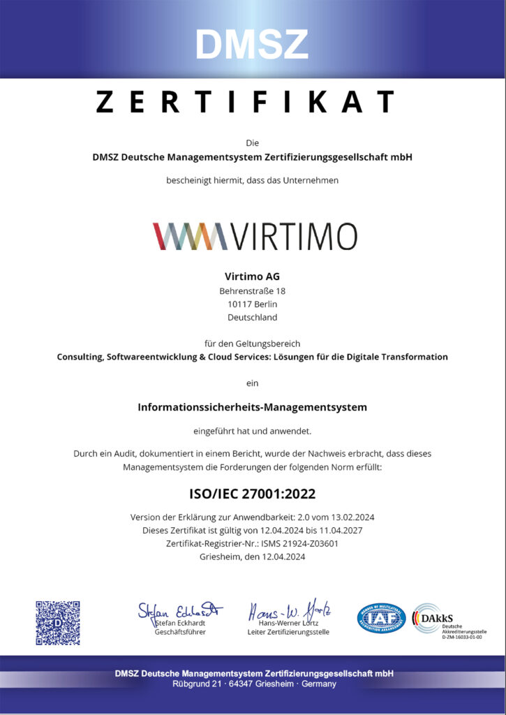 Ihre Informationen in besten Händen. Geprüfte Prozesse in Software und Consulting. Zertifizierte Sicherheit nach ISO/IEC 27001:2022. V wie Verantwortung. Informationssicherheit und der Schutz von Kund:innendaten sind zentrale Säulen unserer Arbeit. Wir freuen uns daher, dass unser Informationssicherheitsmanagementsystem [ISMS] offiziell nach ISO/IEC 27001:2022, dem international führenden Standard für Informationssicherheit, durch die DMSZ [Deutsche Managementsystem Zertifizierungsgesellschaft mbH] zertifiziert ist. Diese Zertifizierung bestätigt unser systematisches Management von Sicherheitsrisiken und die Implementierung robuster Schutzmaßnahmen. Der Geltungsbereich unserer Zertifizierung umfasst unser gesamtes Leistungsportfolio: Consulting, Softwareentwicklung & Cloud Services: Lösungen für die Digitale Transformation Für unsere Kund:innen und Partner:innen bedeutet dies die Gewissheit, mit einem Unternehmen zusammenzuarbeiten, das nachweislich höchste Standards in der Informationssicherheit anwendet und kontinuierlich verbessert. Aufgrund der permanenten Weiterentwicklung in der Informationstechnologie unterliegen diese Informationssicherheitsleitlinie und alle darauf aufbauenden Richtlinien und Konzepte der fortlaufenden Anpassung und Weiterentwicklung. Die Informationssicherheitsleitlinie ist für alle Beschäftigten von Virtimo einsehbar und wird auf Wunsch auch interessierten Kund:innen und Partner:innen zur Verfügung gestellt. Herunterladen Geprüft, engagiert, ausgezeichnet. Erfahren Sie, wo wir uns stark machen. Zu unserem Engagement Haben Sie Fragen?Ihre Ansprechpersonen bei Virtimo. Christoph FuchßVorstandVirtimo AGKontakt aufnehmen Stephanie TaeuscherLeiterin Marketing + CommunicationVirtimo AGKontakt aufnehmen